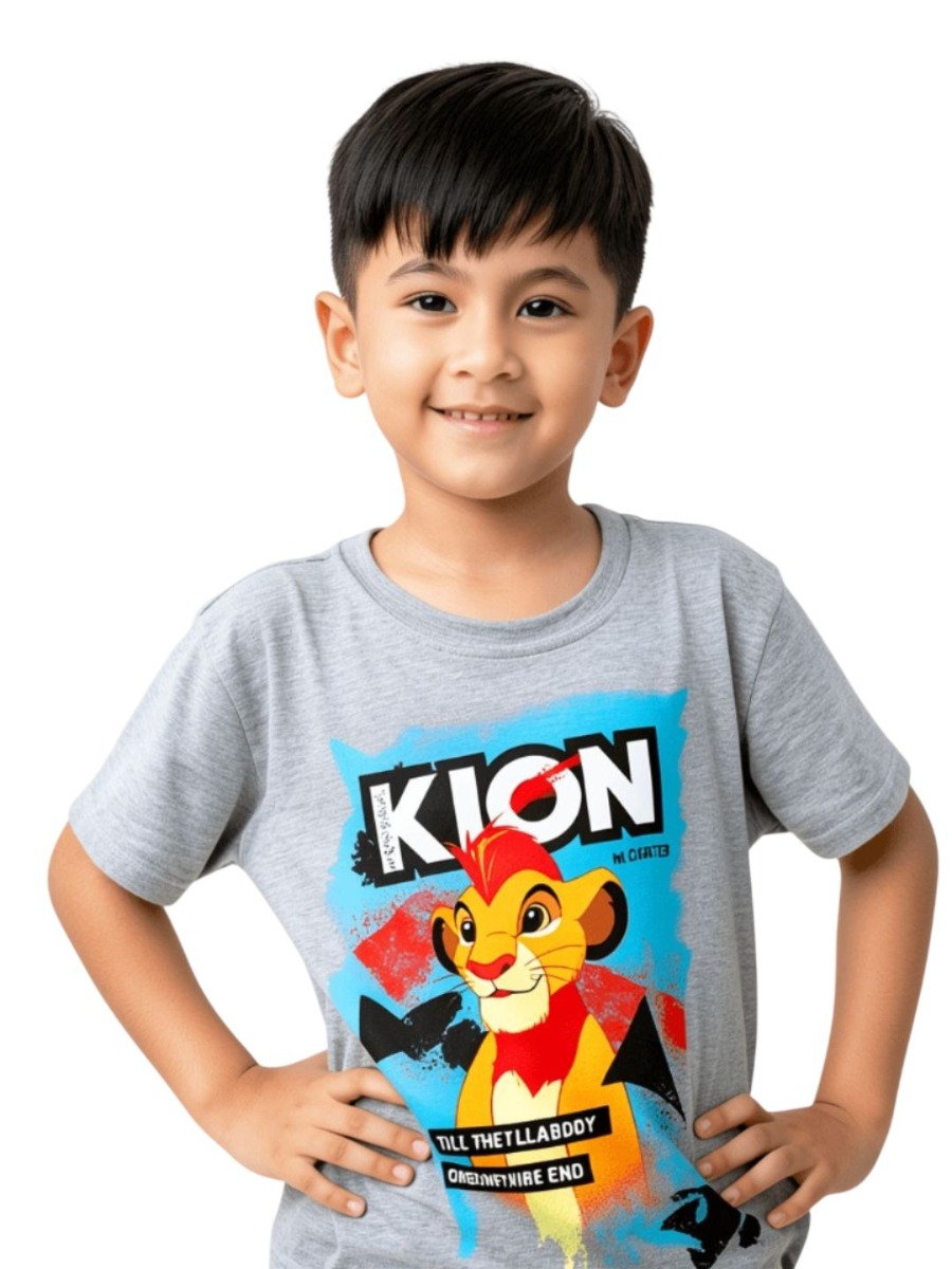 Trendy boys grey t-shirt featuring a vibrant Kion character graphic. Soft, comfortable, and perfect for everyday casual wear.