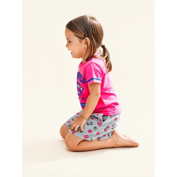 Add a fun, energetic vibe to your child’s wardrobe with this stylish Girls Casual Co-ord Set. The outfit includes a bright pink t-shirt designed with a bold Metropolis graphic print, paired with soft grey shorts featuring a playful all-over pattern. The coordinated design creates a fashionable and eye-catching look ideal for casual outings, playdates, and daily wear.