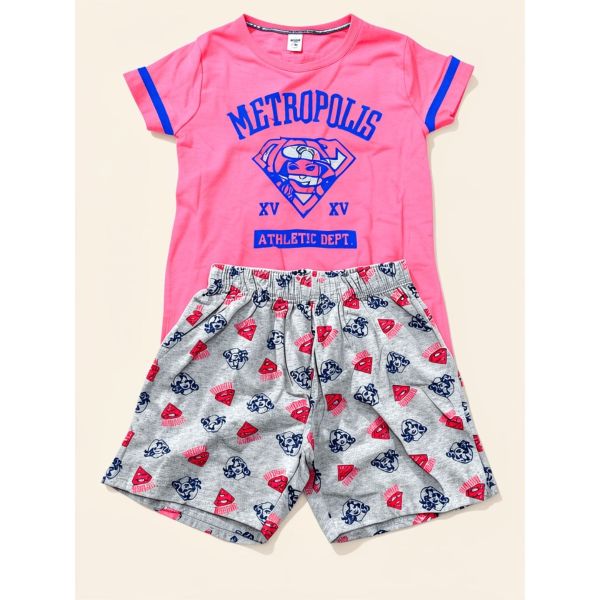 Trendy girls combo featuring a vibrant Metropolis graphic t-shirt paired with comfortable printed shorts. Perfect for playful everyday wear.