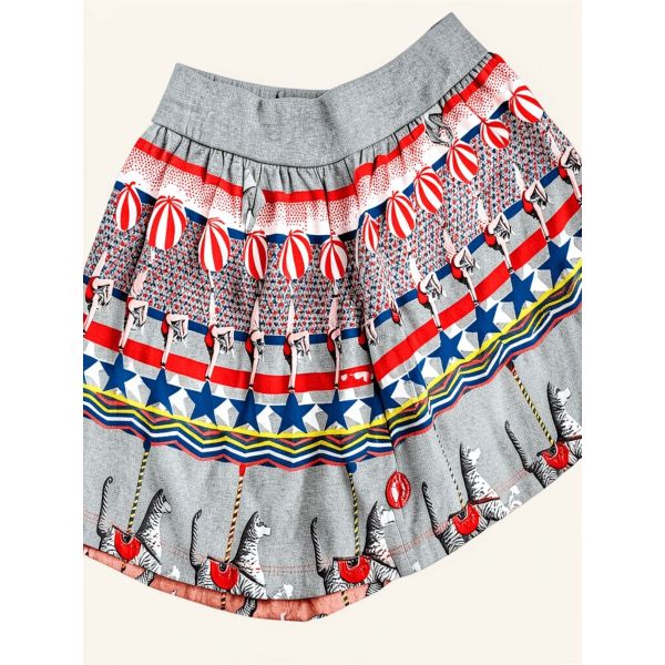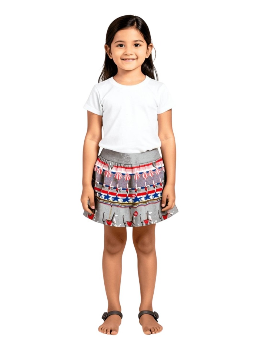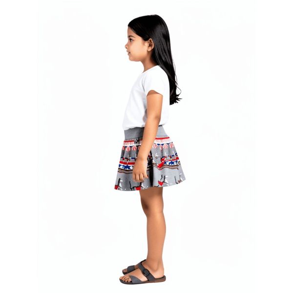 Stylish girls grey mini skirt featuring a vibrant carnival-inspired print. Comfortable, playful, and perfect for casual outings or festive looks.