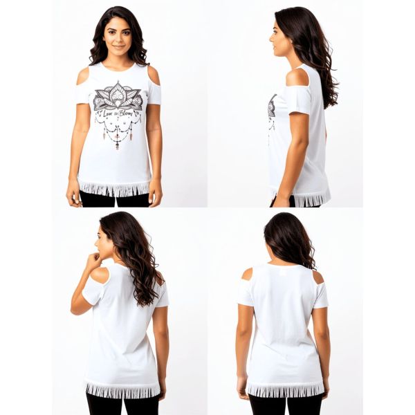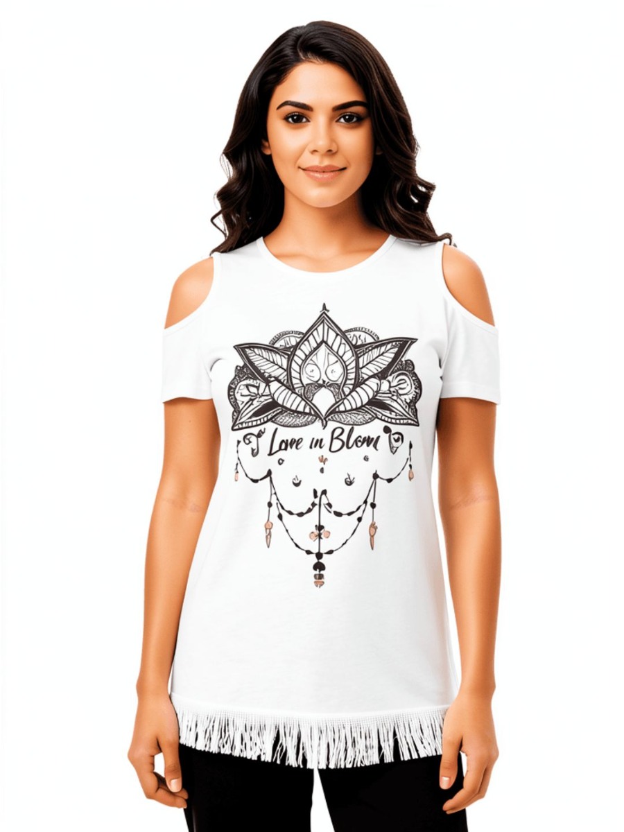 Stylish women’s white cold-shoulder T-shirt featuring the elegant Love in Bloom floral graphic. Soft fabric, modern fit, and perfect for everyday casual wear.