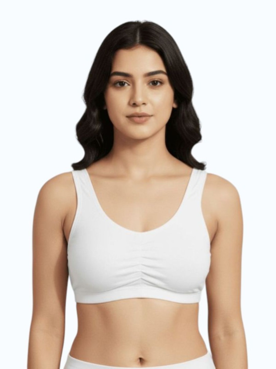 A soft, seamless white bra top featuring a ruched front detail and wide straps for everyday comfort and a smooth, supportive fit.