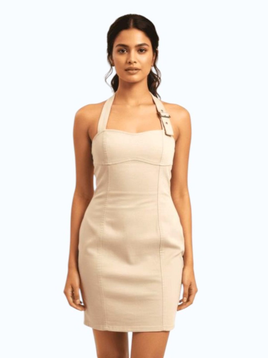 A sleek, solid beige bodycon dress featuring a halter neckline with adjustable strap detail. Designed for a flattering fit, perfect for casual chic looks or evening outings.