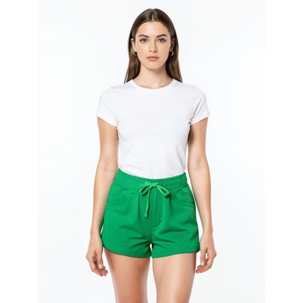 Refresh your casual essentials with these solid green cotton shorts. Crafted from soft and breathable fabric, these shorts provide lasting comfort throughout the day. The elastic waistband paired with an adjustable drawstring ensures a secure and flexible fit. Designed with convenient side pockets and a relaxed silhouette, these shorts are perfect for lounging, casual outings, or daily wear. A clean, minimal design makes them easy to pair with any t-shirt or top.