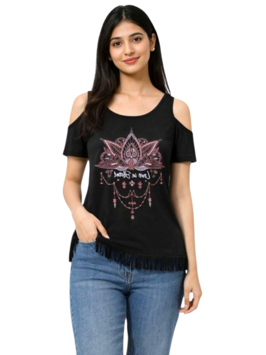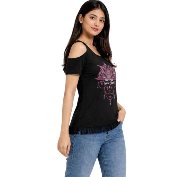 The cold-shoulder cut enhances its contemporary appeal, while the small, flattering fit offers a comfortable silhouette ideal for daily wear. Made from soft, breathable fabric, it keeps you relaxed throughout the day—perfect for casual outings, college wear, travel, or weekend styling.